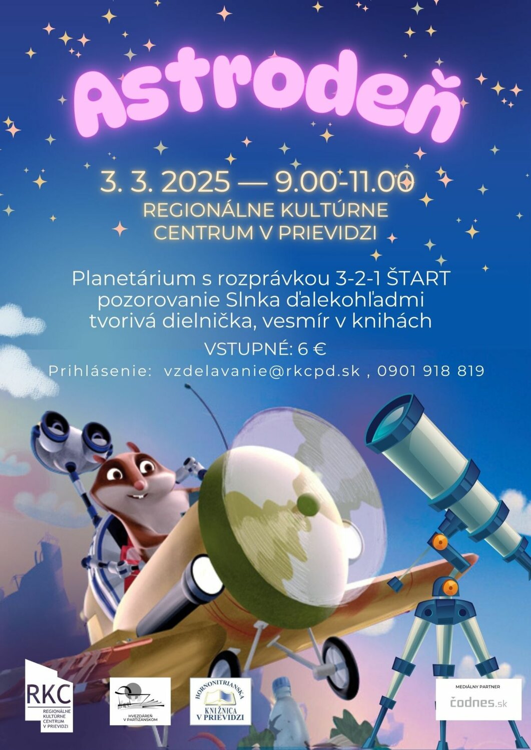 V spolupráci s Hvezdárňou v Partizánskom a Hornonitrianskou knižnicou v Prievidzi pre vás pripravujeme počas jarných prázdnin zážitkový astrodeň v priestoroch Regionálneho kultúrneho centra v Prievidzi.